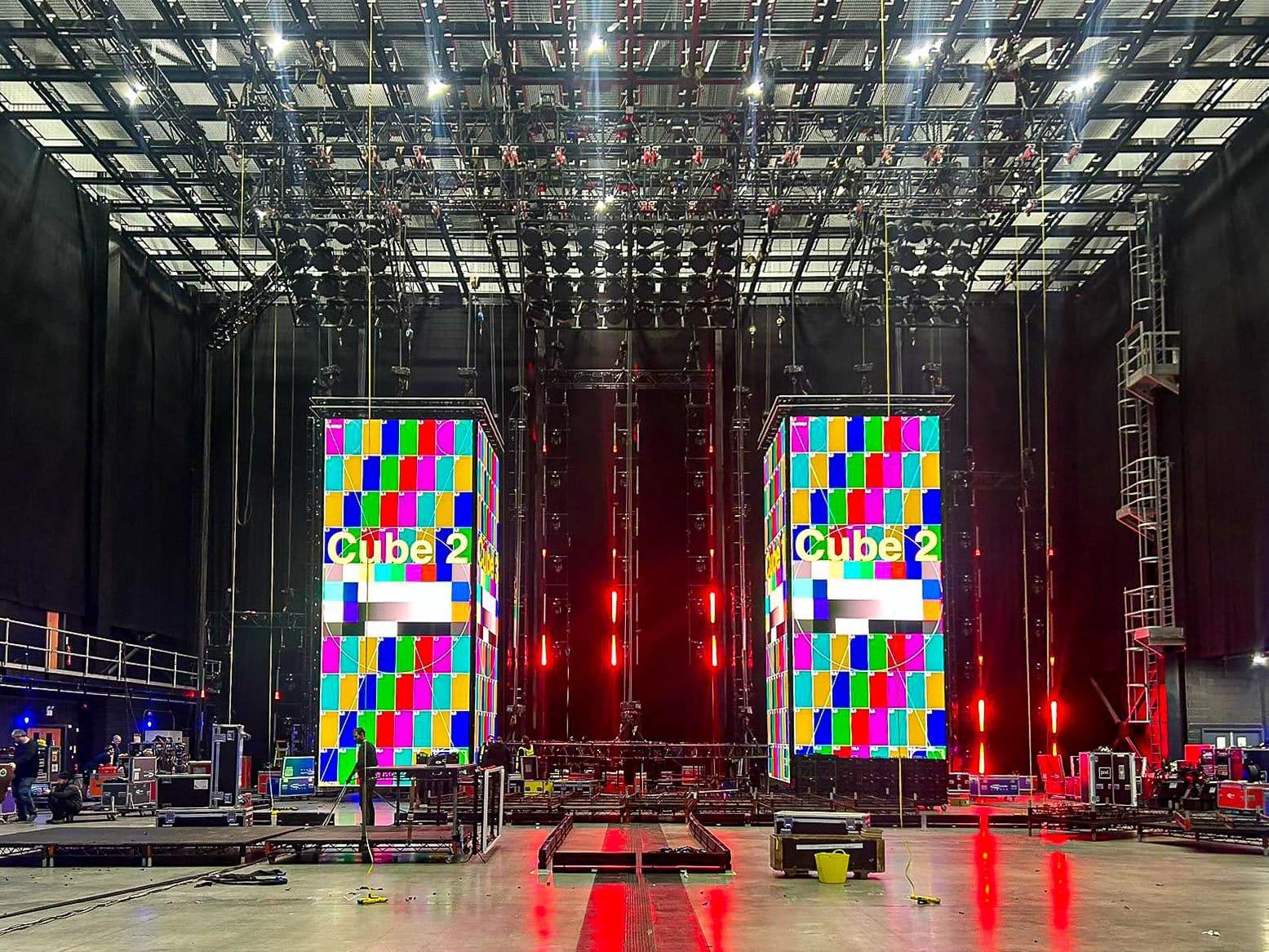 The design of the show was a perfect mix of lighting and LED visuals, creating a vibrant atmosphere for the audience. The LED screens were arranged in two 3-sided towers that were 10 meters tall. Additional BQ4 & ROE Vanish 8 screens were hung in a diamond formation using Kinesys motors allowing for independent automation over both screens which featured centrally above the stage.