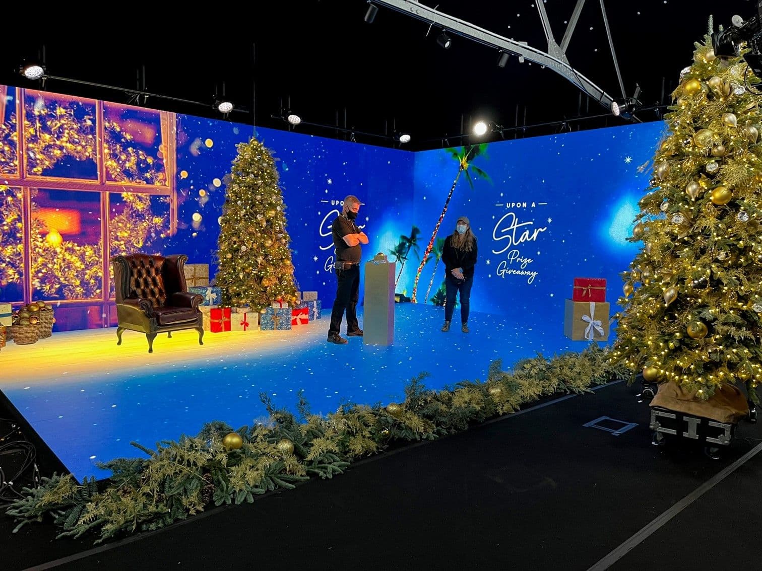 The P&O Cruises brief was to create a Christmas themed backdrop in a TV studio. Pixl recommended using Studio 8, which has a 3mm LED back wall and a 4mm LED floor. Using this technology, the Pixl team was able to create an immersive extended reality (xR) environment to surround the presenters. Pixl worked with the client to design and create the virtual environment, while also providing all the crew and labour for the studio, including production manager, vision director, camerapersons, stage manager, makeup artists, audio, lighting, crew catering, and more.